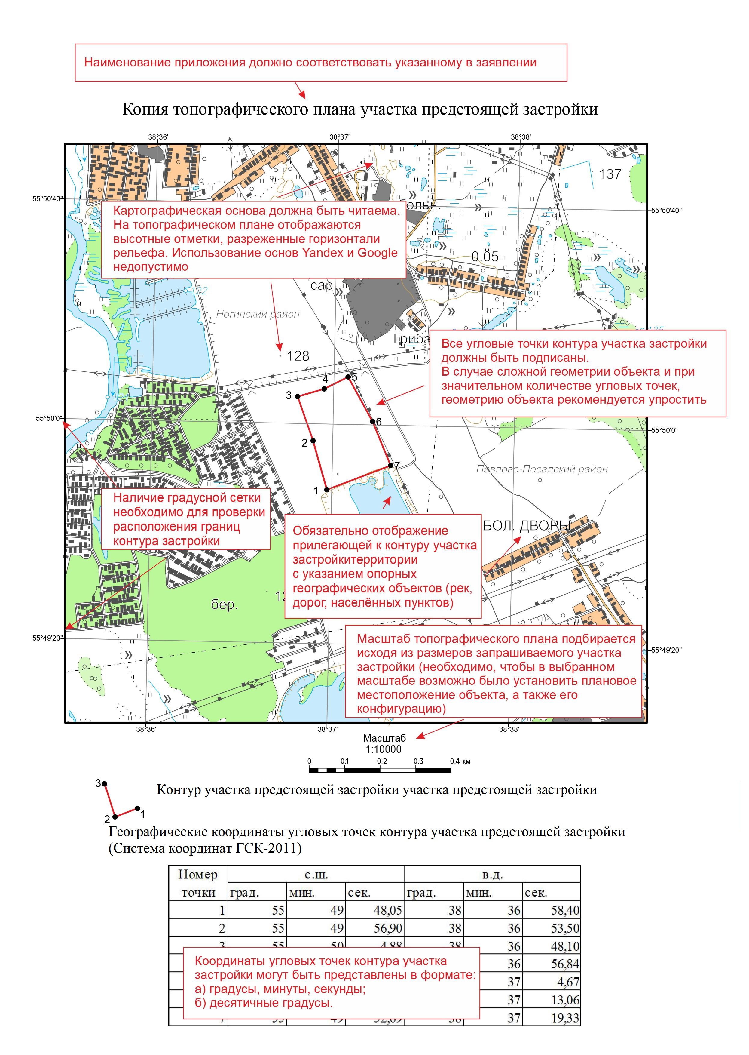 - Топографический план участка предстоящей застройки и прилегающей к ней территории (в масштабе не мельче 1:10 000, а для линейных объектов - не мельче 1:50 000), с указанием внешних контуров участка и географических координат его угловых точек с использованием единой электронной картографической основы, создаваемой в соответствии с законодательством о геодезии и картографии;
